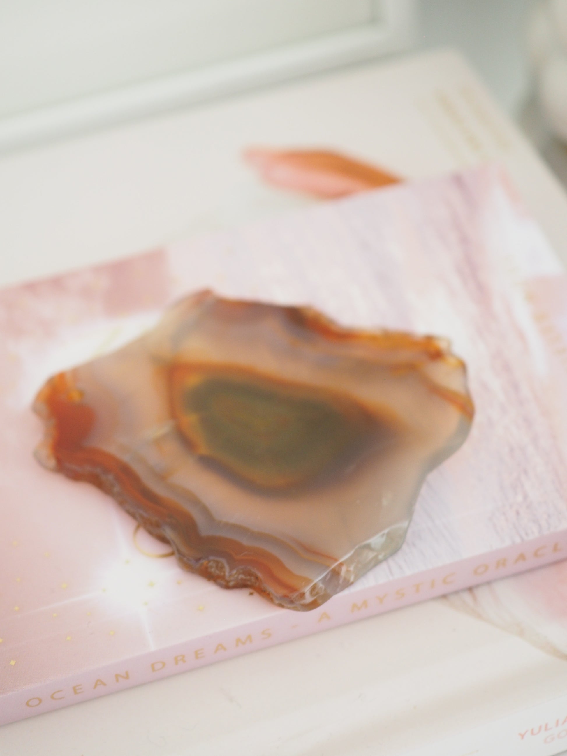 Schöne Achatscheibe. Mit Lederband als Kette tragbar, als Anhänger für Weihnachtsbaum oder einen Repräsentativen Schrank.