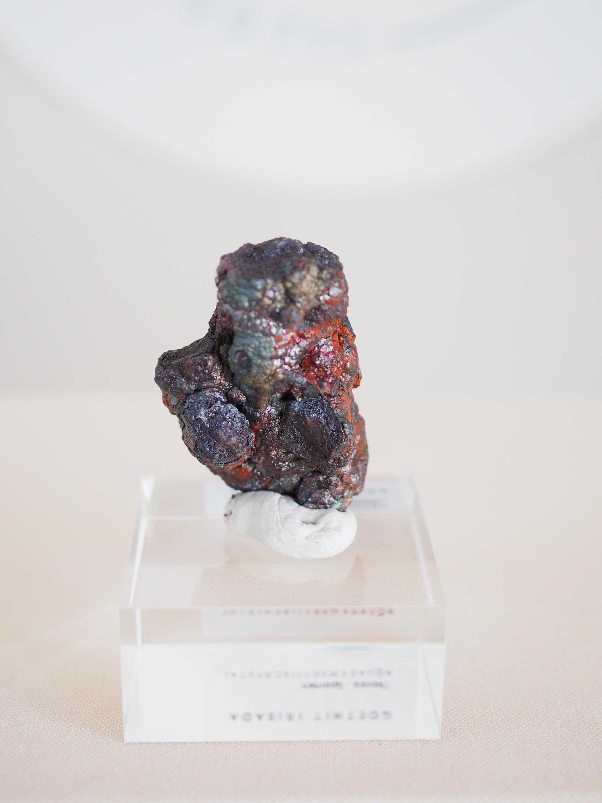 Bunt schimmernder Goethit aus Tharsis Specimen auf Acryl Base. Die irisierenden Farben und schillernden Farbreflexe machen das Specimen zu einem ausdrucksstarken Akzent in deiner Mineraliensammlung.