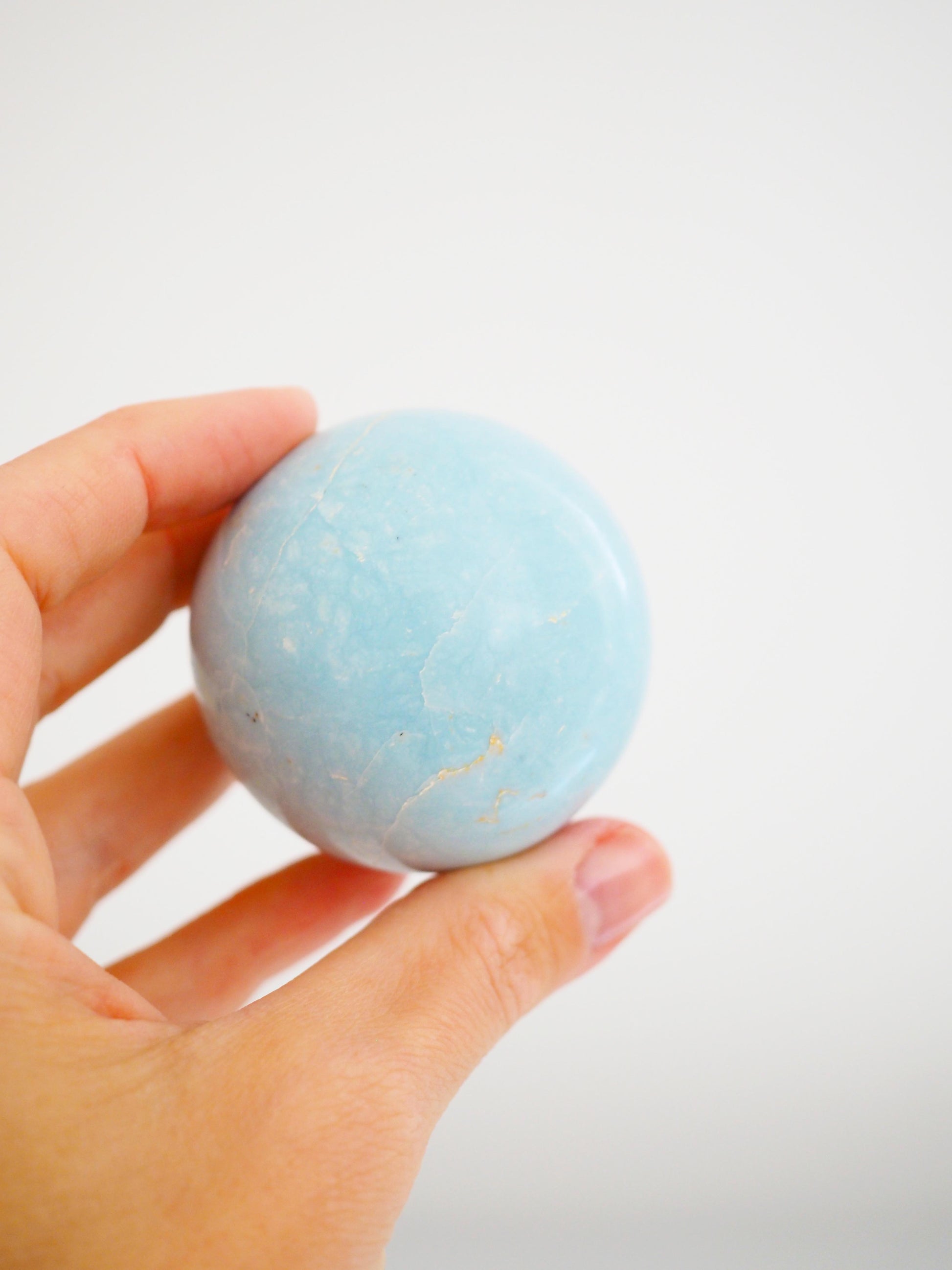 Diese polierte Kugel zeigt eine schöne türkis-blaue Färbung mit natürlichen, charakteristischen Maserungen und Adern.