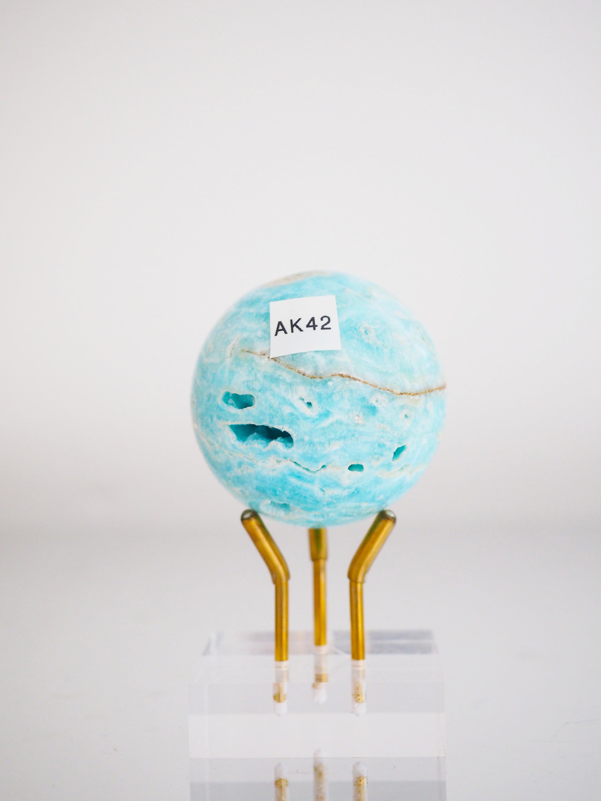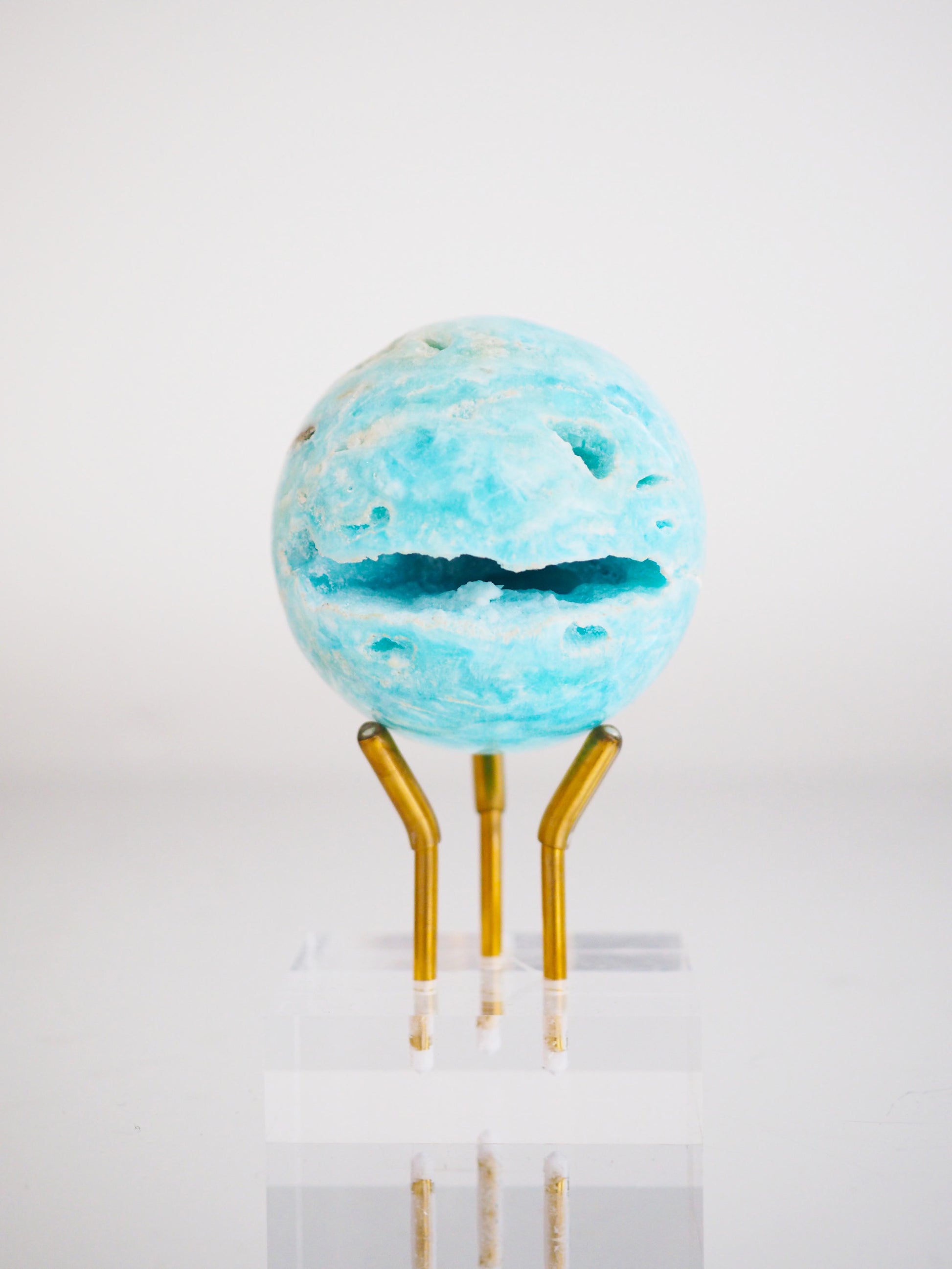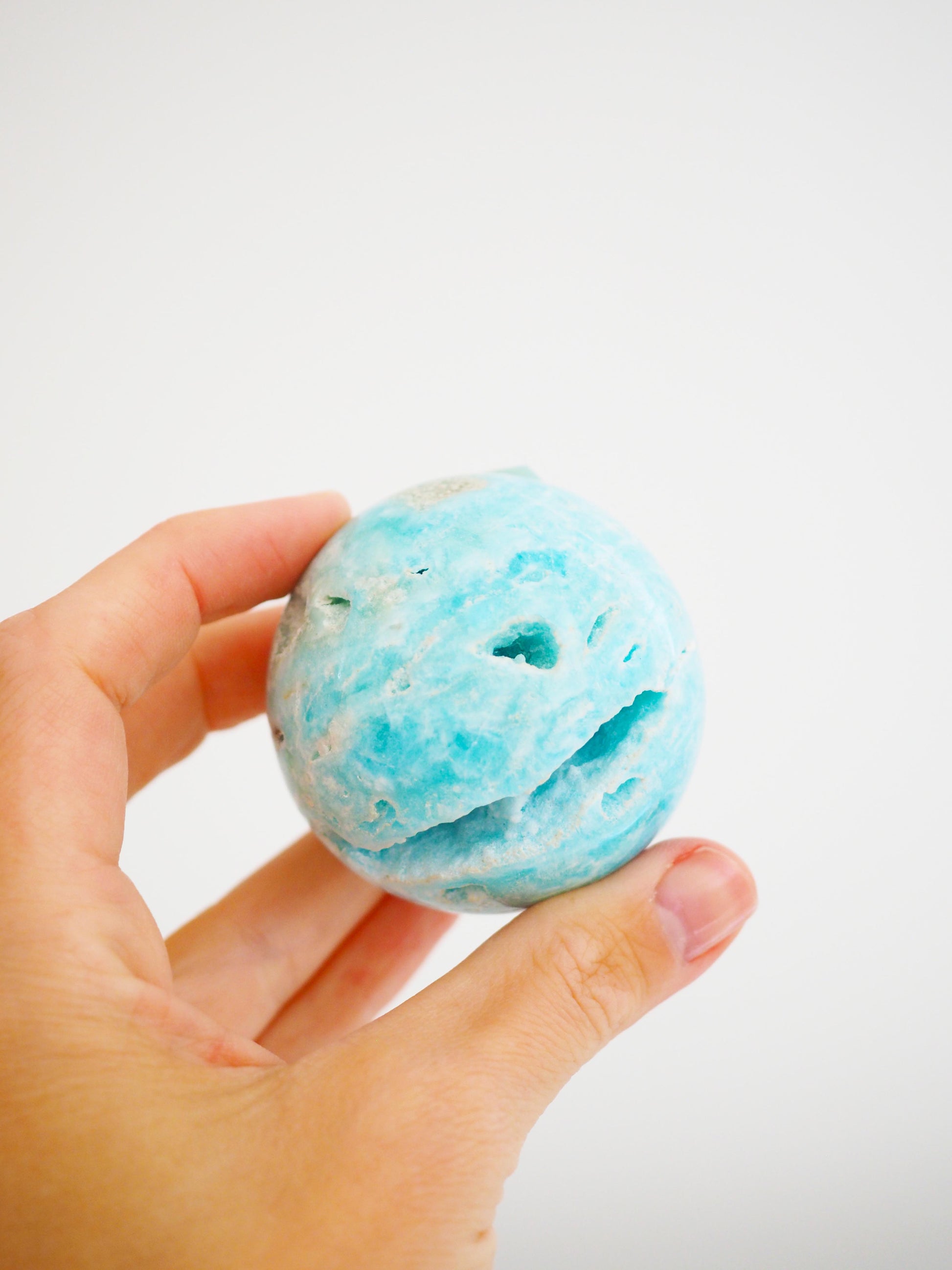 Dieses Kugel vereint karibisch-blauen Calcit mit warmem braunem Aragonit, wodurch ein faszinierendes Farbspiel entsteht. Die glatte Oberfläche und die natürliche Textur machen jedes Stück zu einem Unikat.