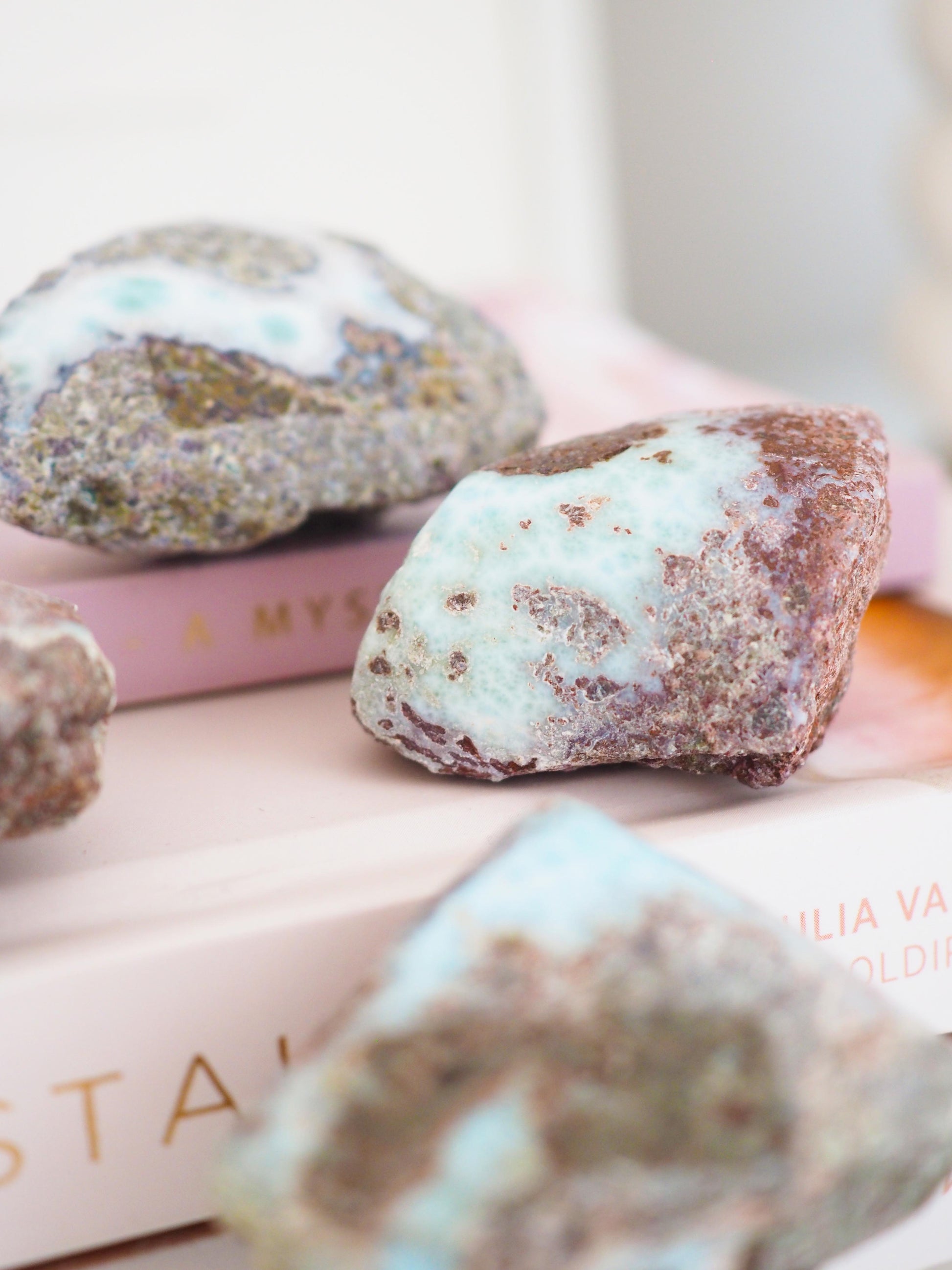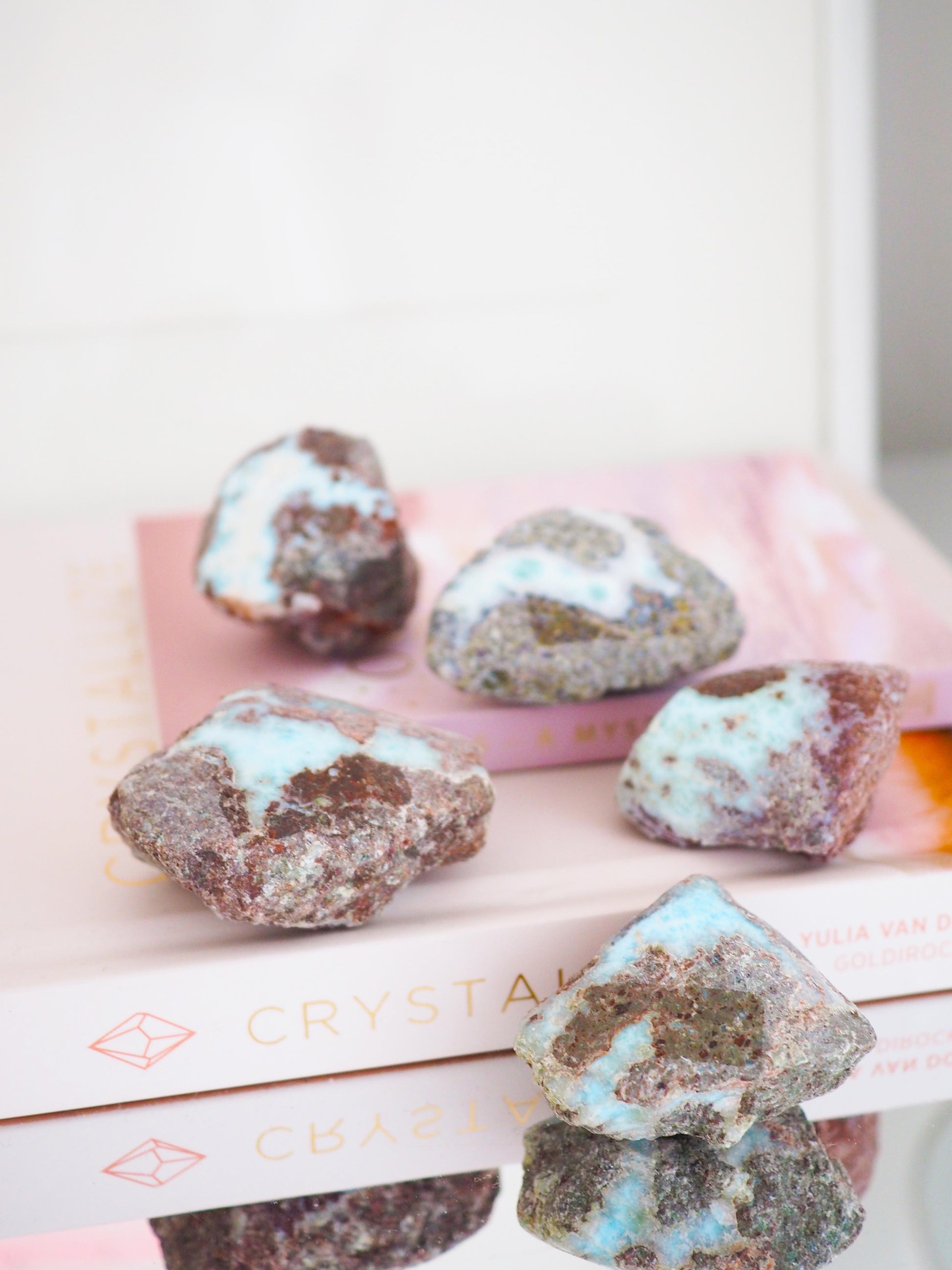 x FACTS Die Larimar Rohstücke haben kleine Abdrücke vom Kleber der Ettiketten