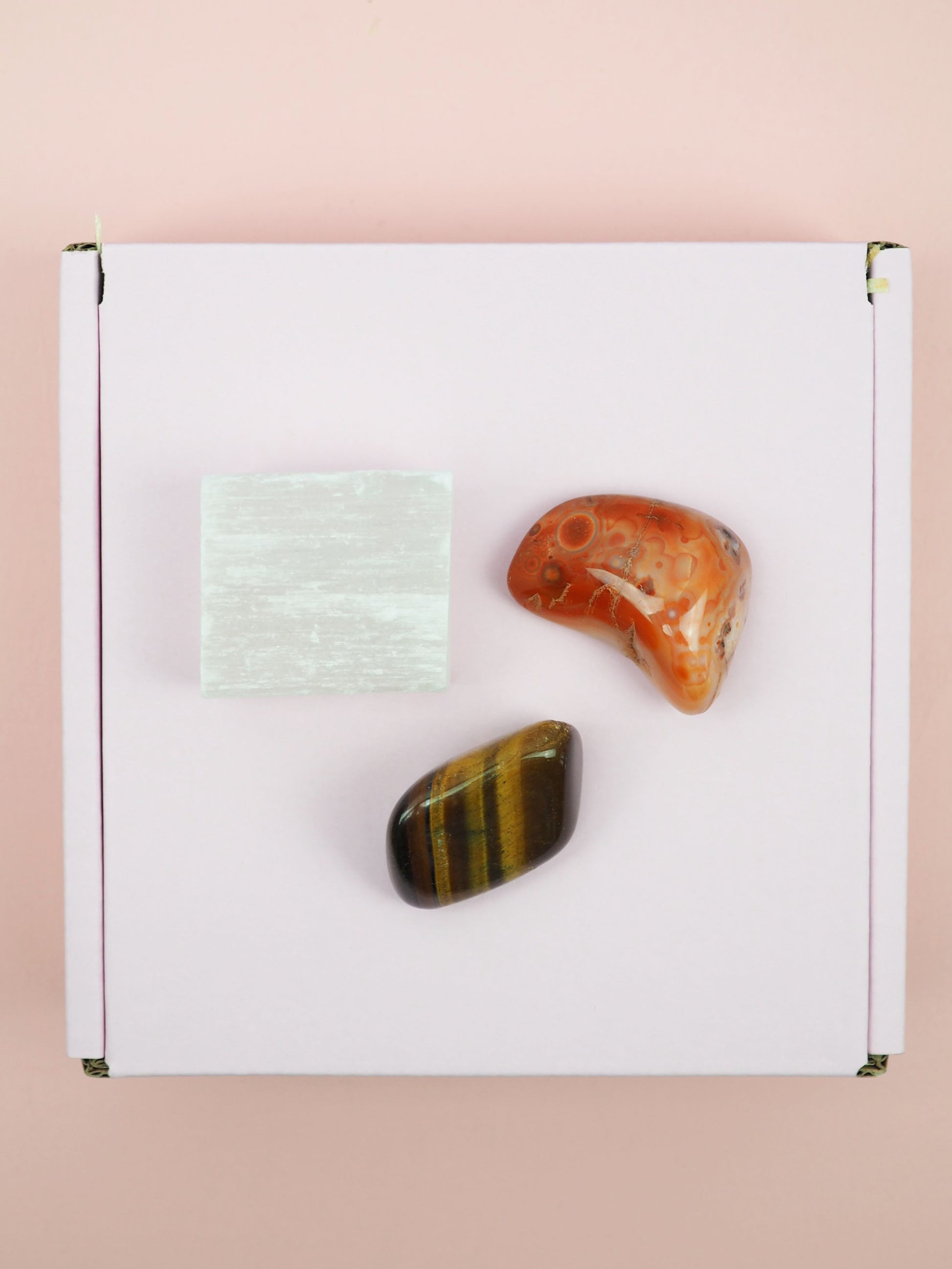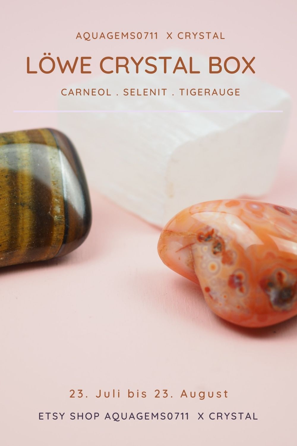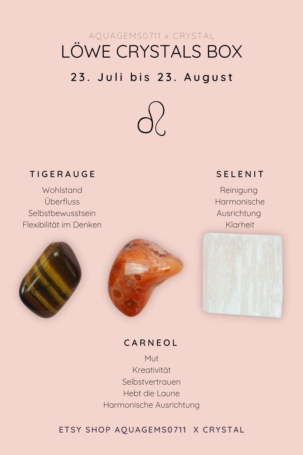 Premium Geschenk Set für Sternzeichen Löwe. Tigerauge, Karneol, Selenit. wunderschön verpackt in einer Rosa Box.
