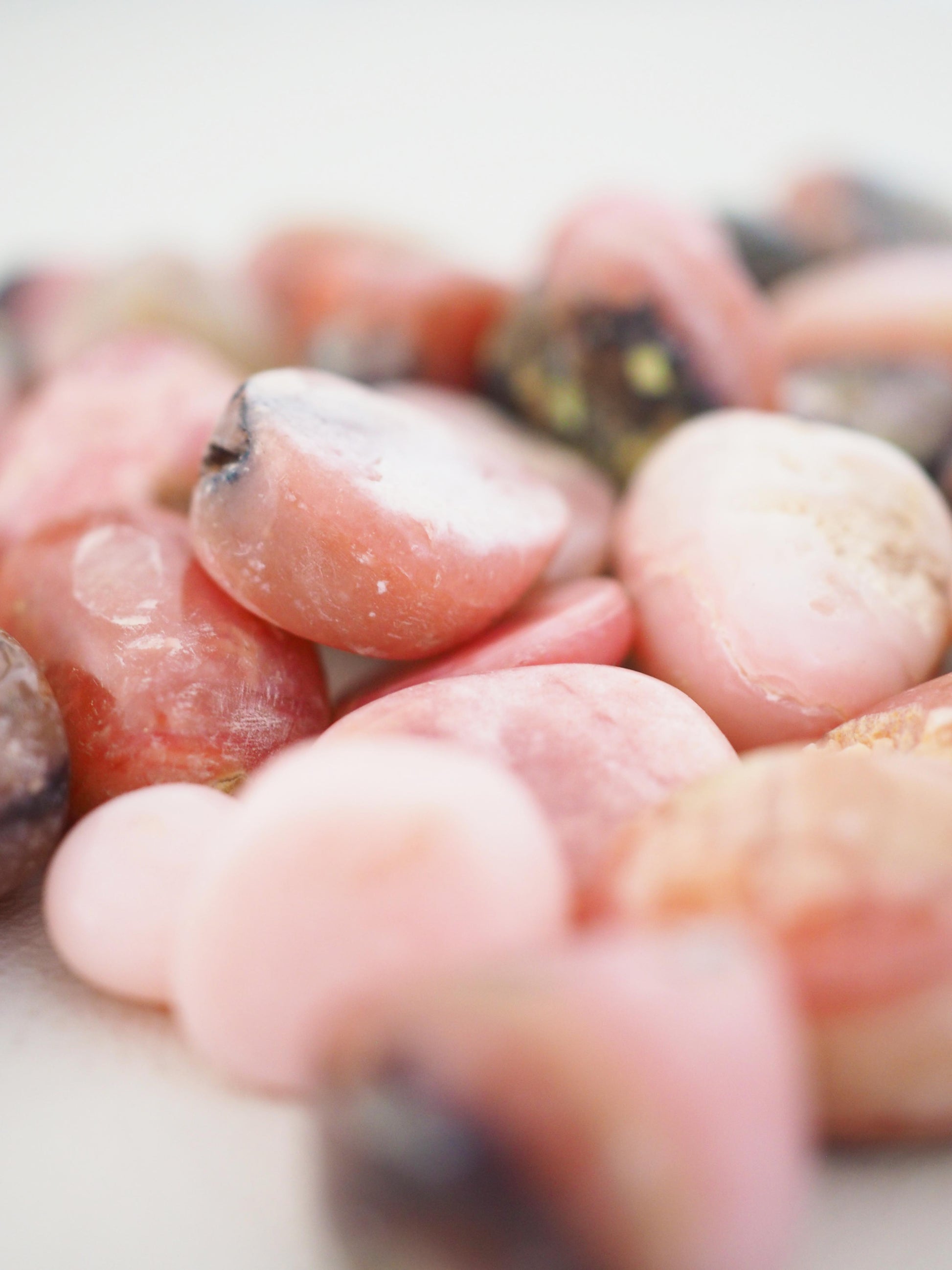 Pinker Anden Opal Trommelstein aus Peru. Hellrosa bis Dunkelrosa. Rare