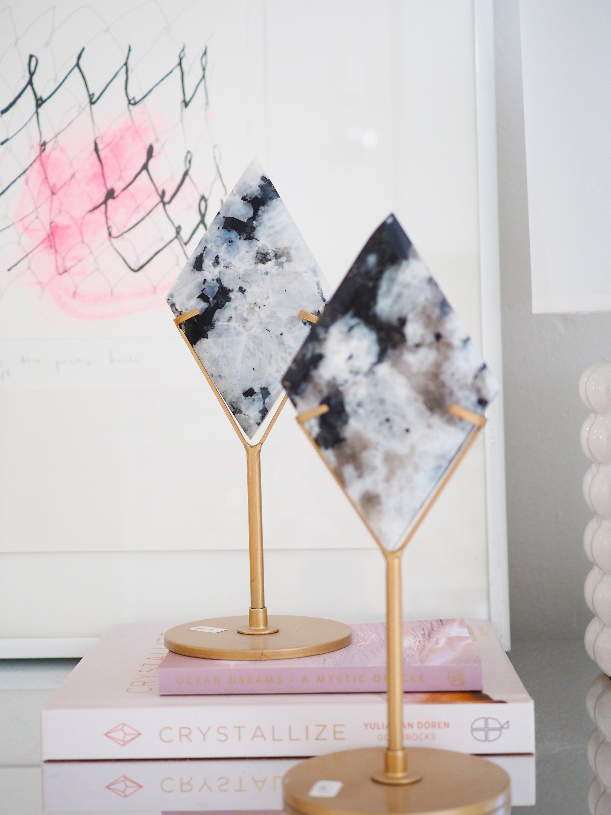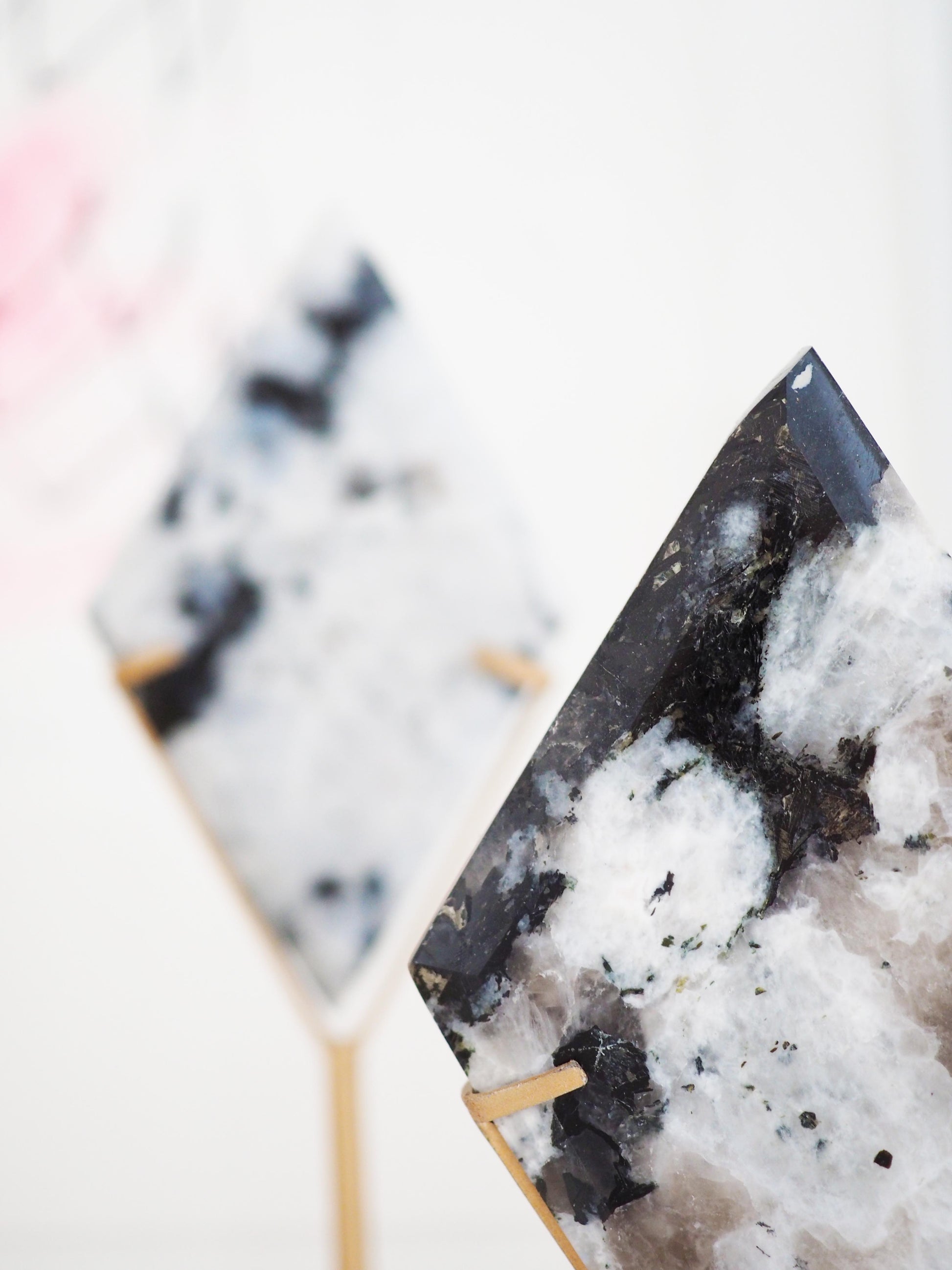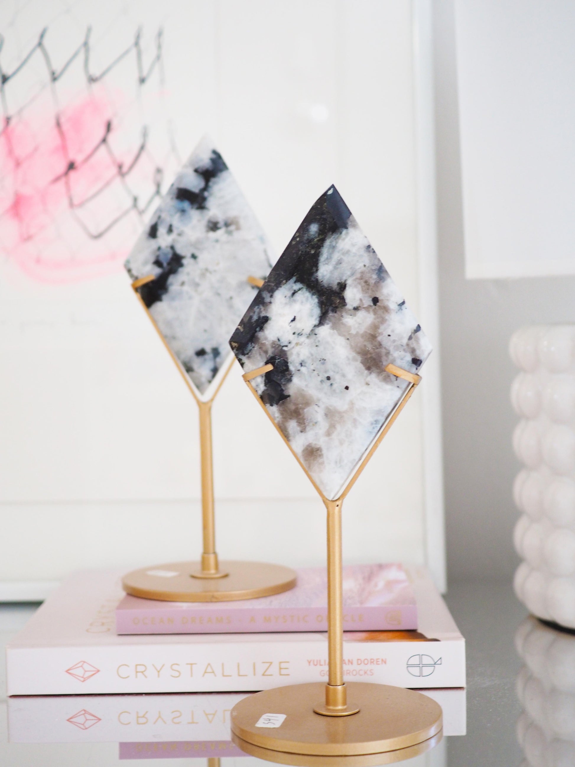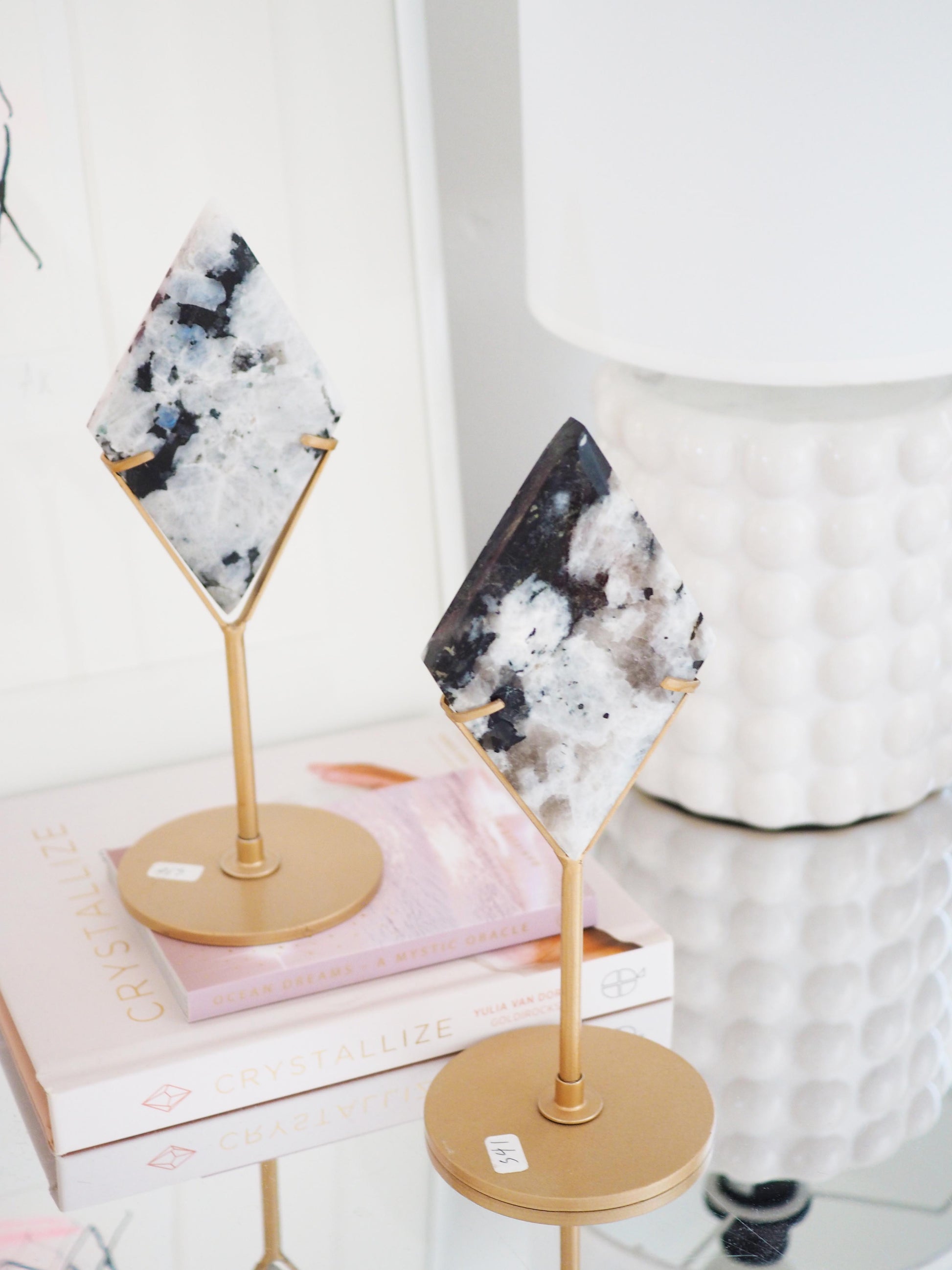 Blau flashy Regenbogen Mondstein mit schwarzem Turmalin in wunderschöner Diamantform auf Halter