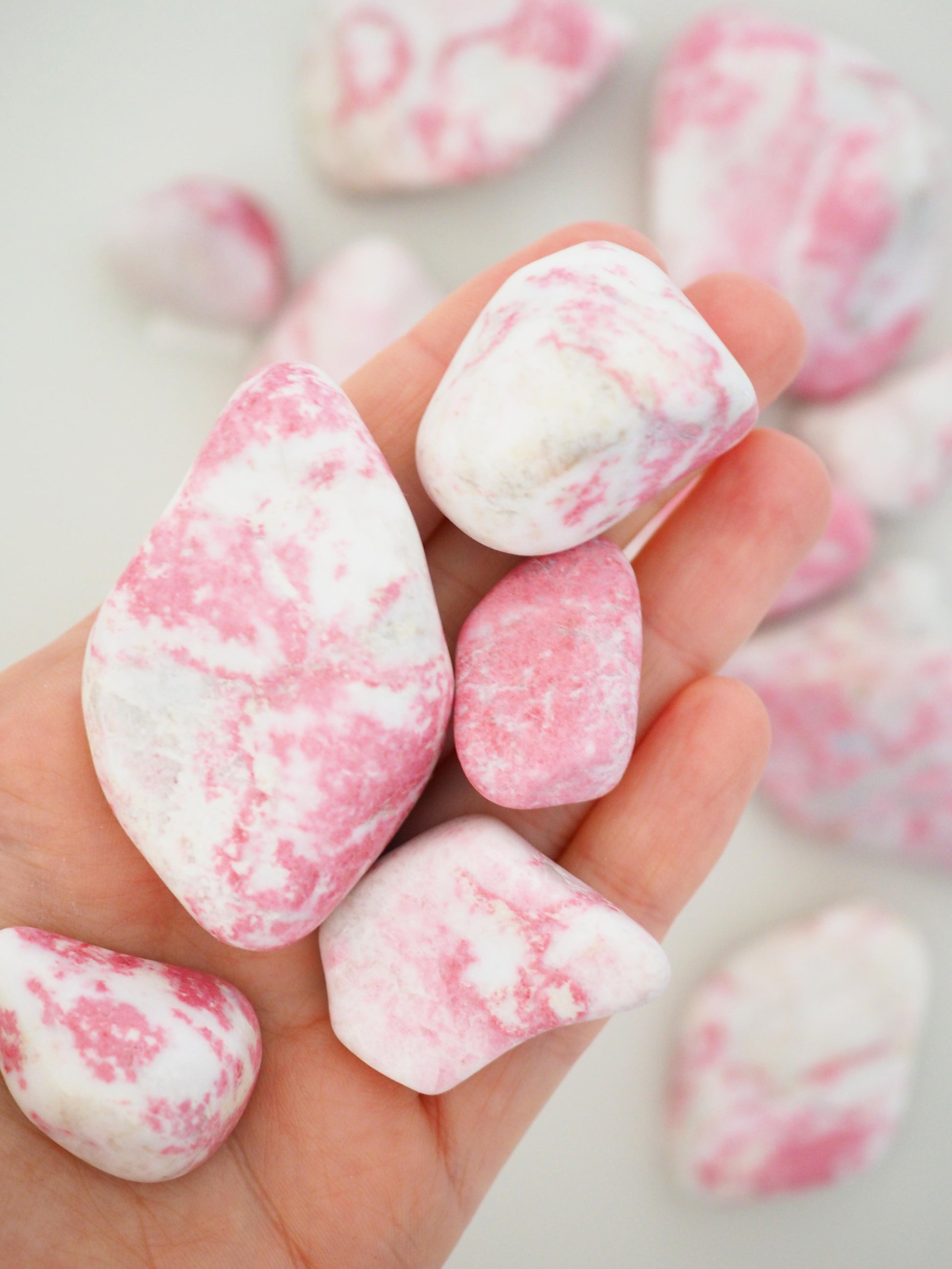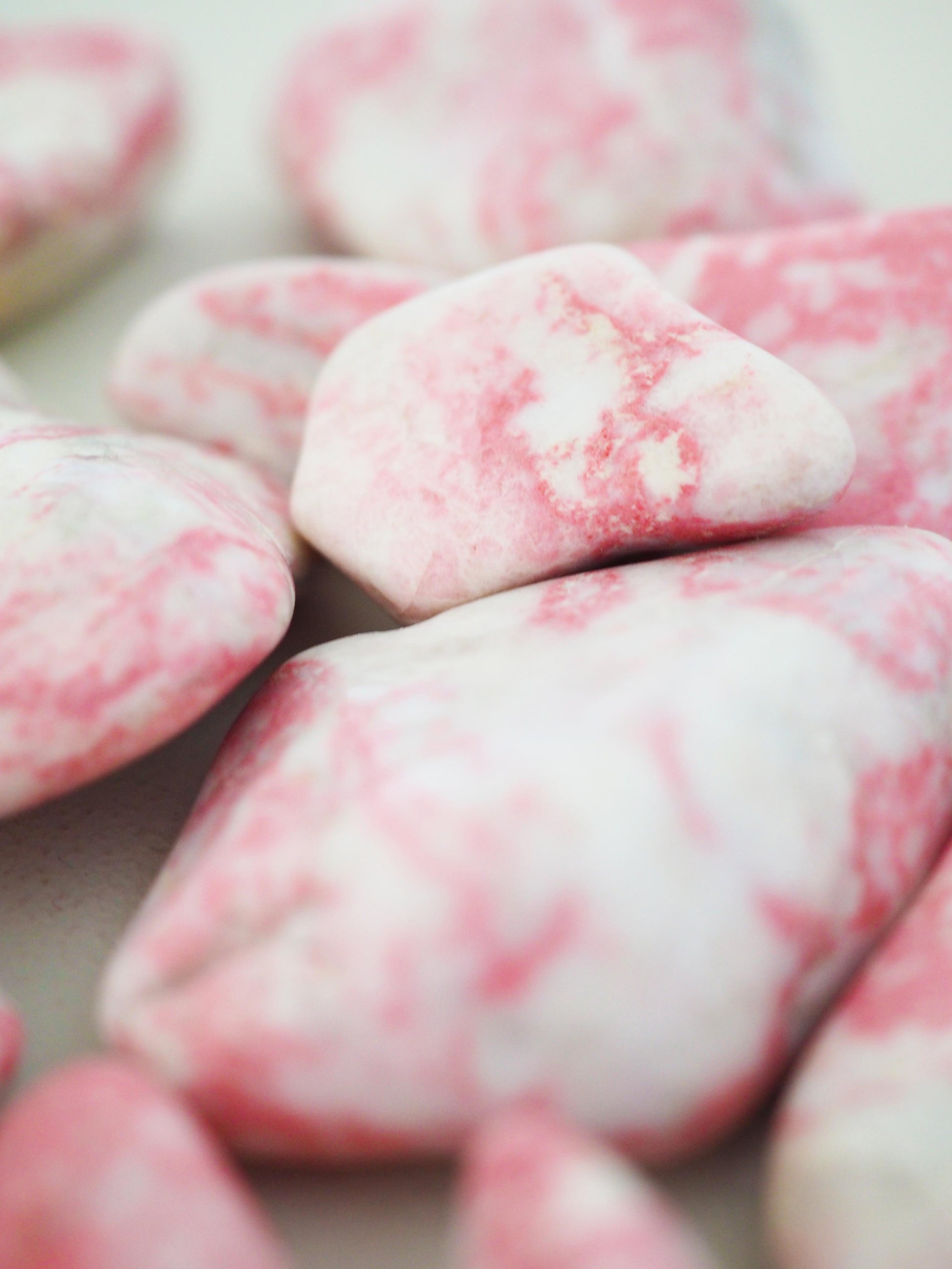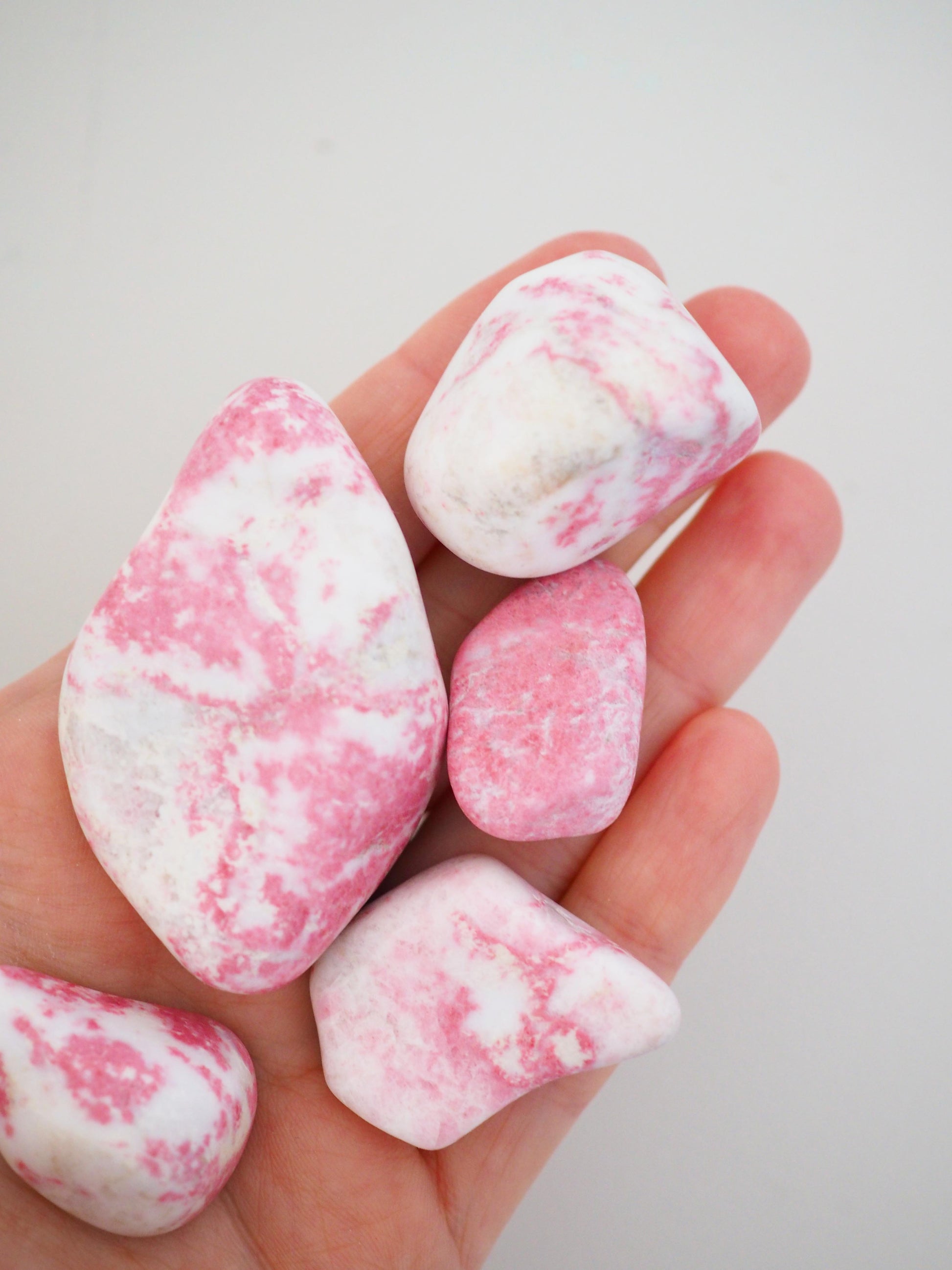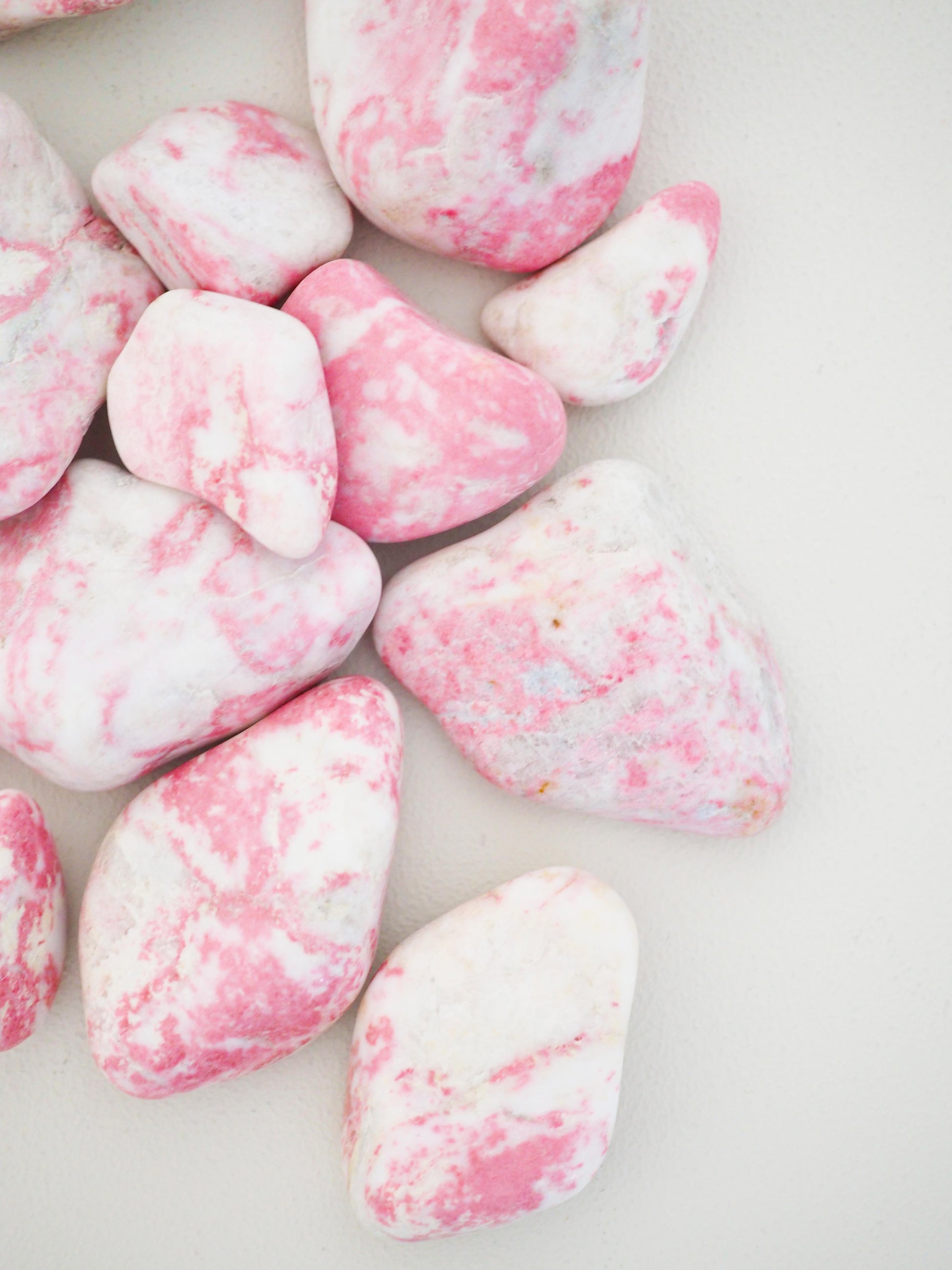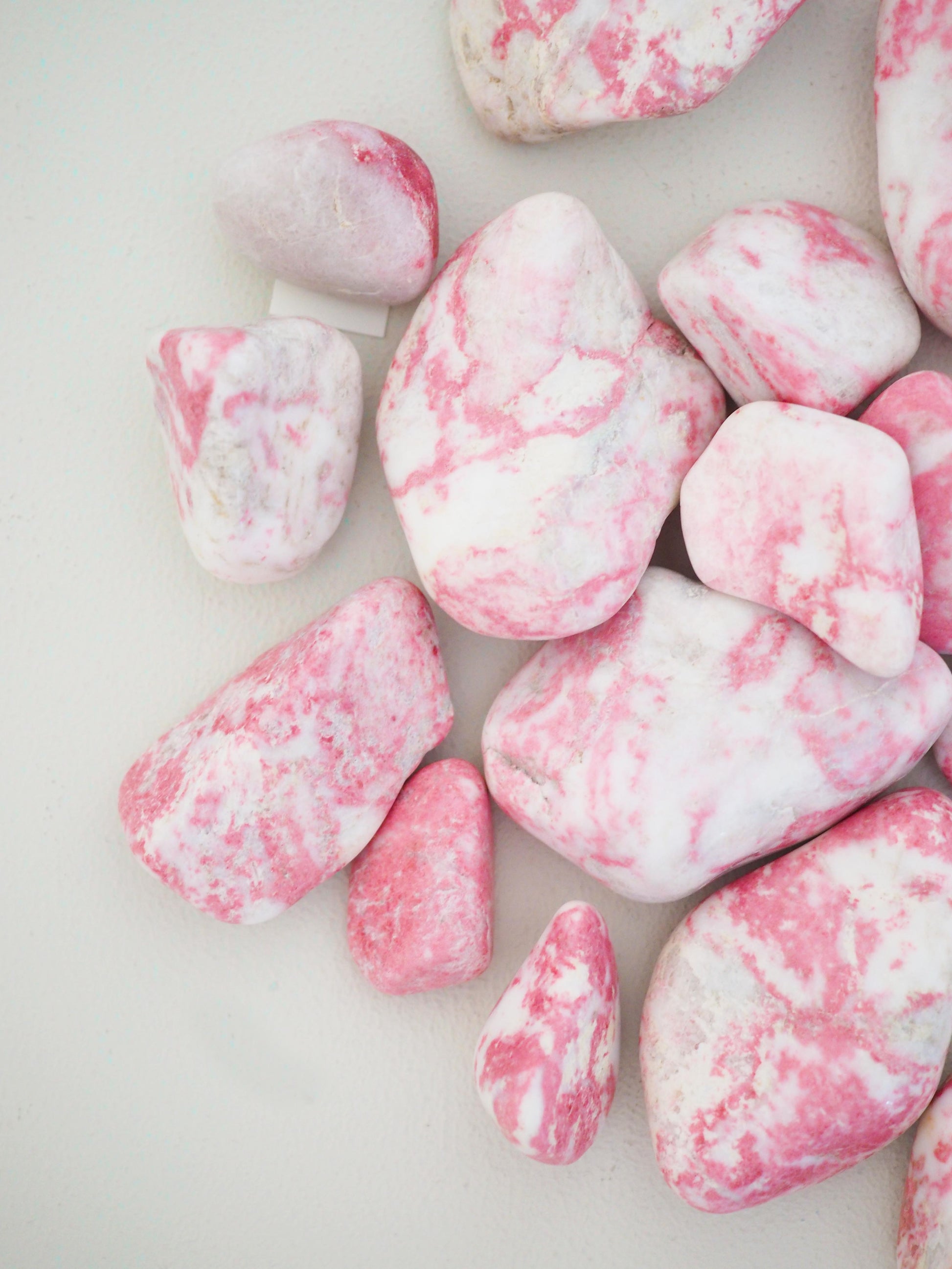 Ihr durftet Abstimmen ob ihr Thulit in ganz pink oder in Mischung mit weißem Gestein haben wollt. Ihr habt euch für den Weiss Pinken Mix entschieden! Wir finden eine super Entscheidung, denn man kann wunderbar sehen wie sich die Thulit Adern durch das Gestein nesteln.