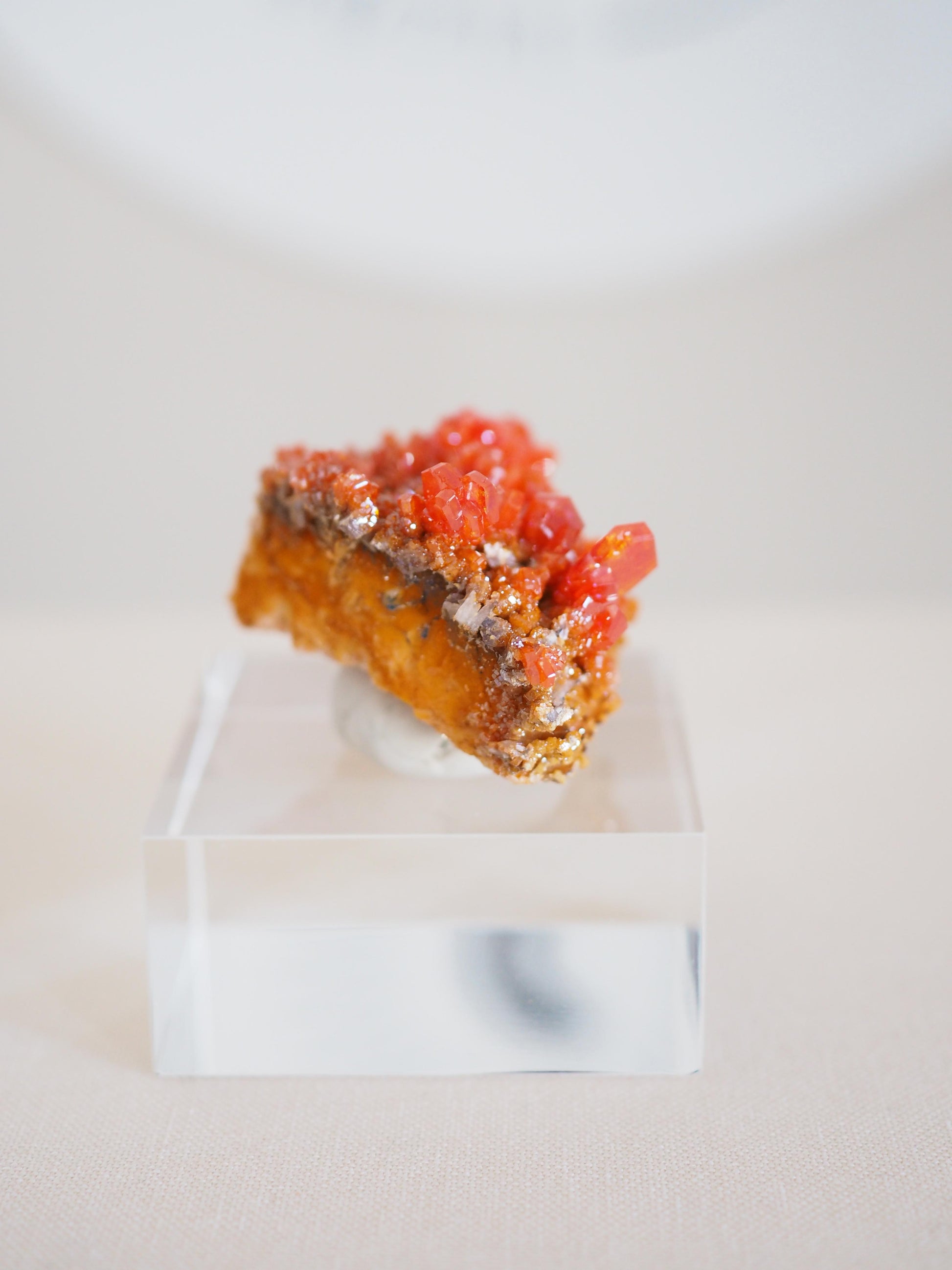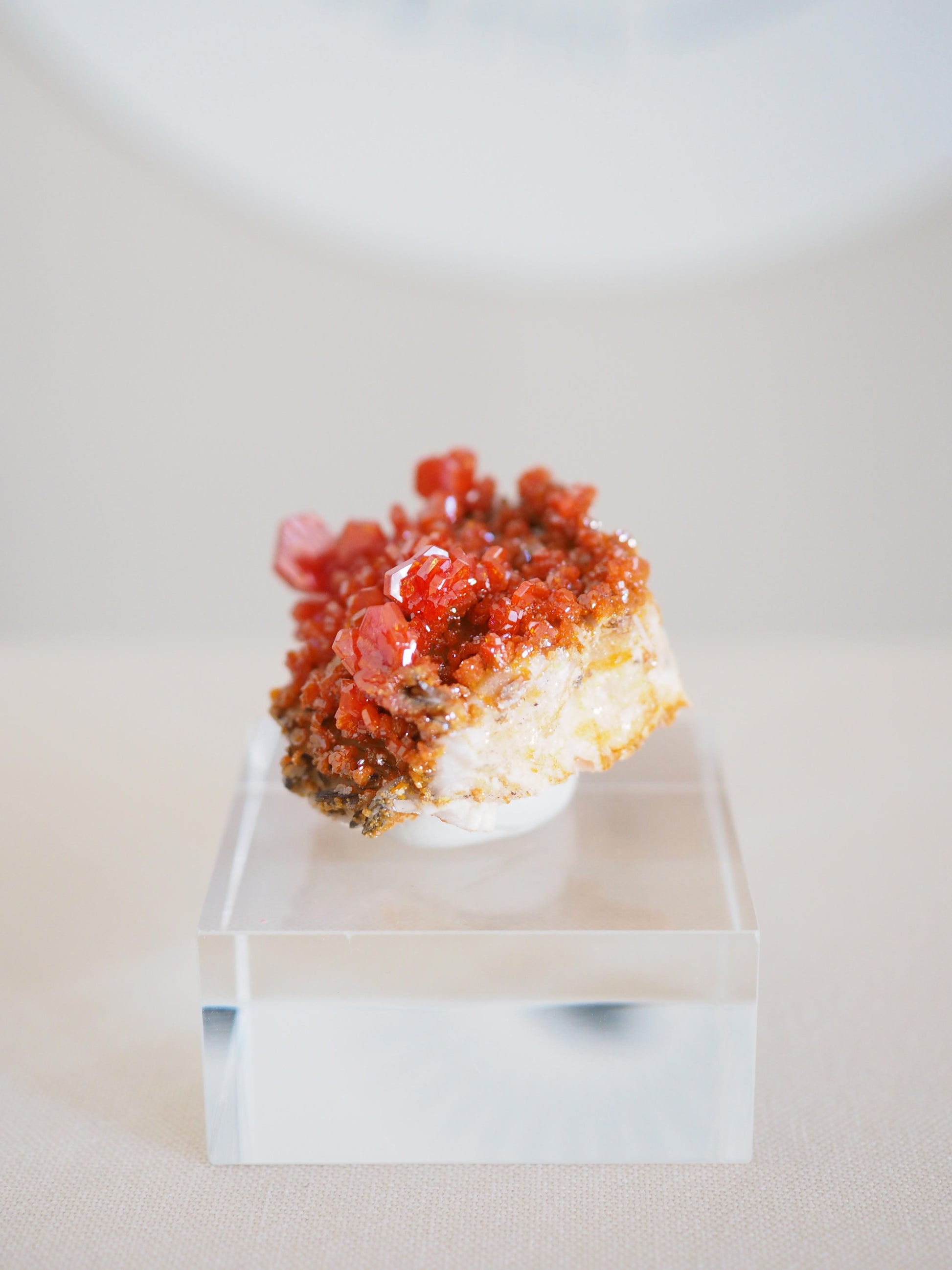 Die Präzise gewachsenen, hexagonalen Vanadinit Kristallen mit dem wunderschönen, funkelnden Farbverlauf von tiefem Rot bis Orange auf Matrix sind ein Hingucker in jeder Sammlung.