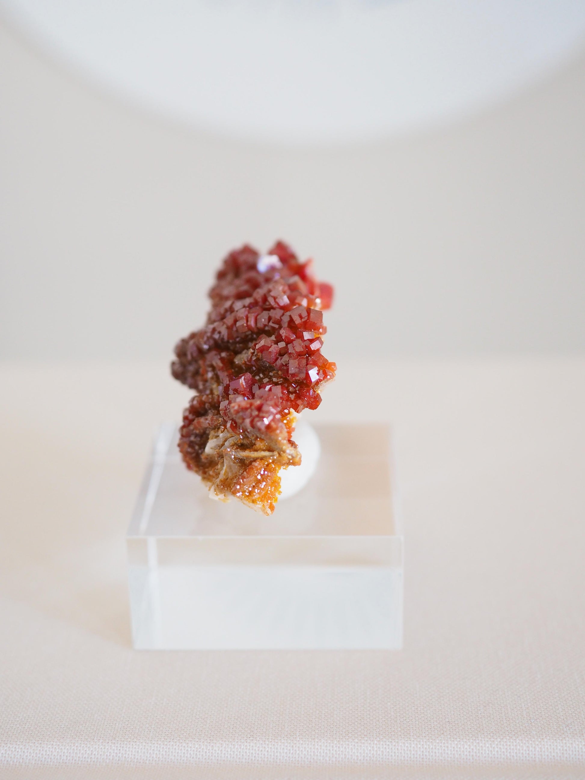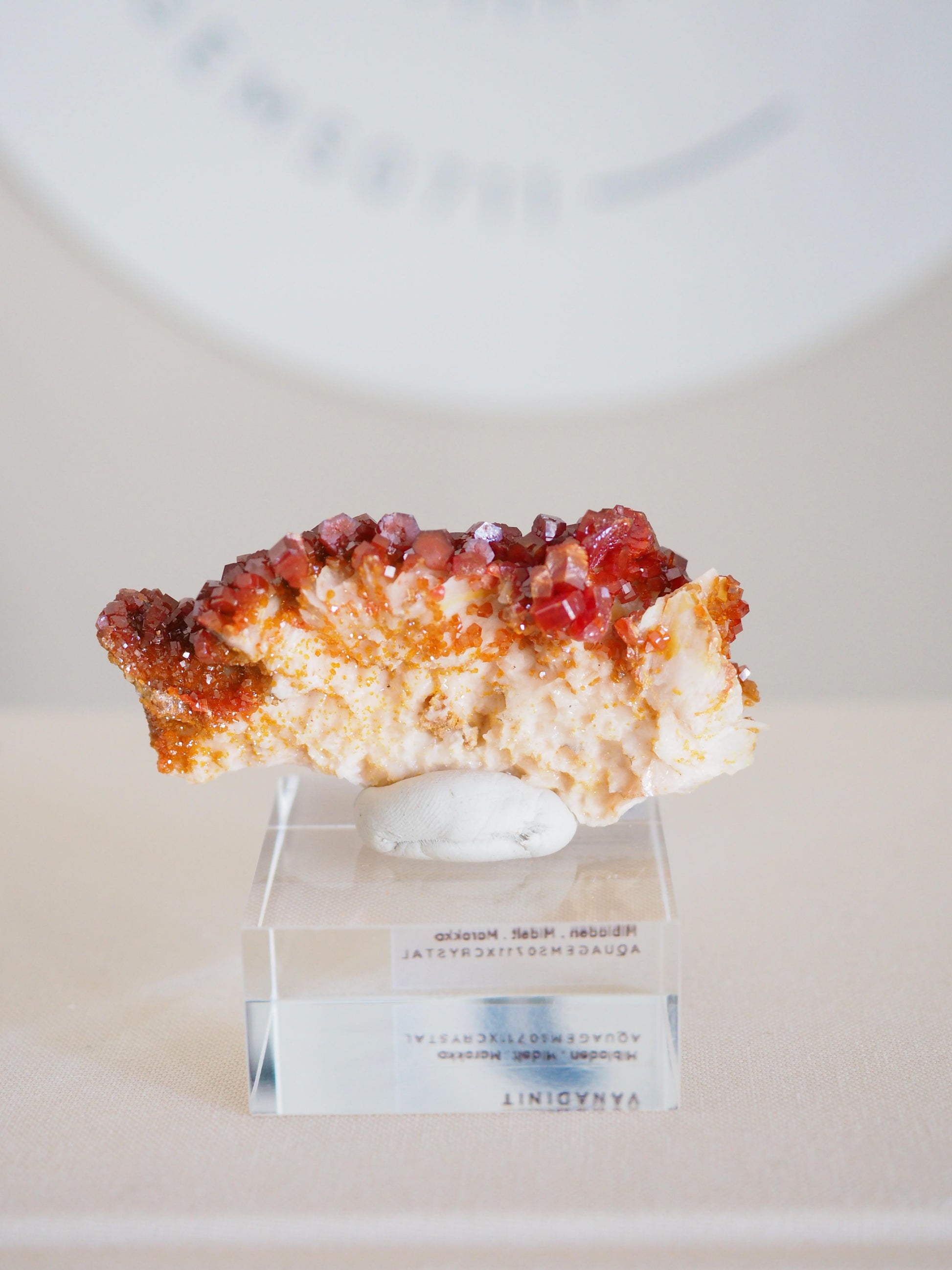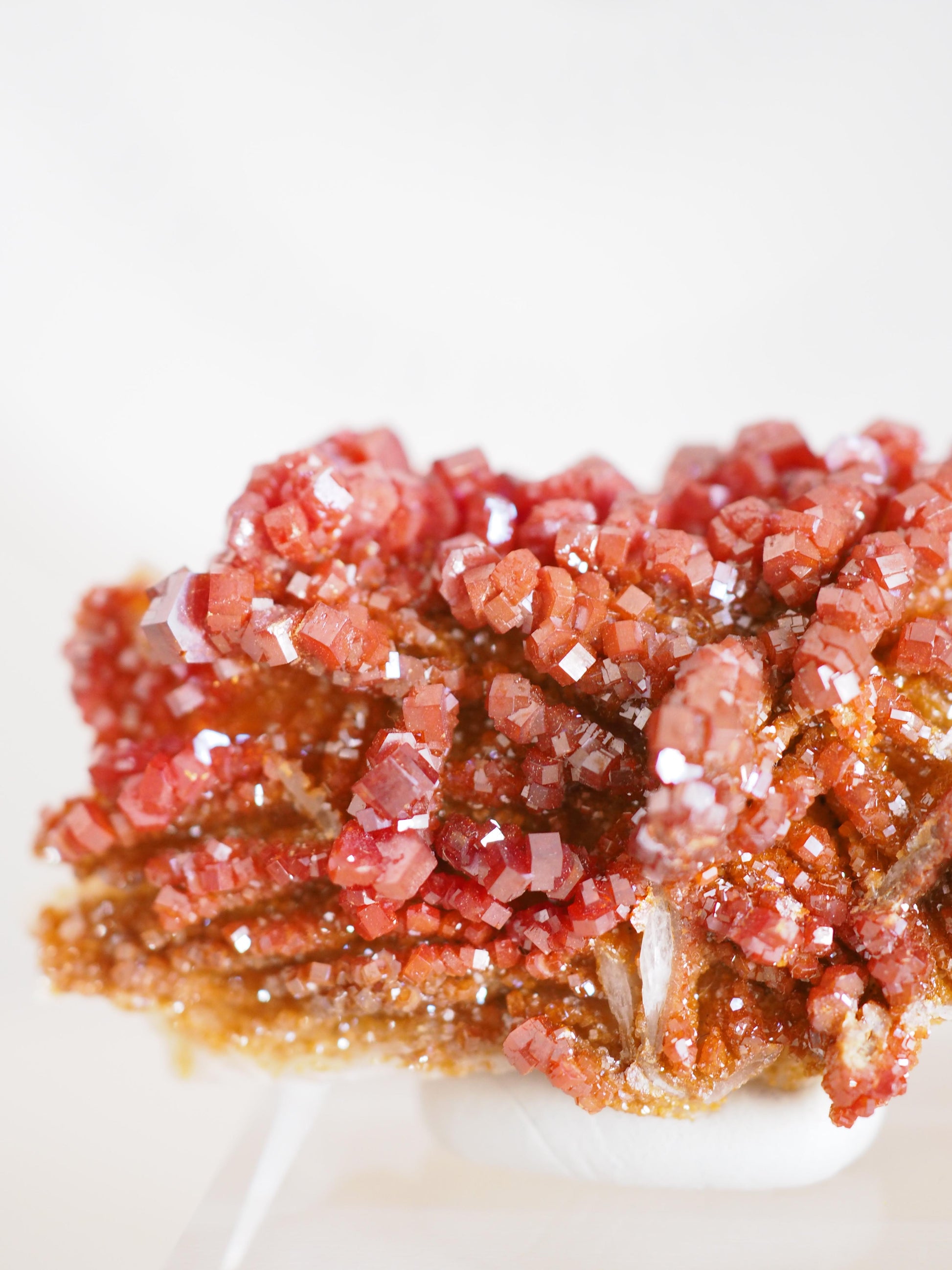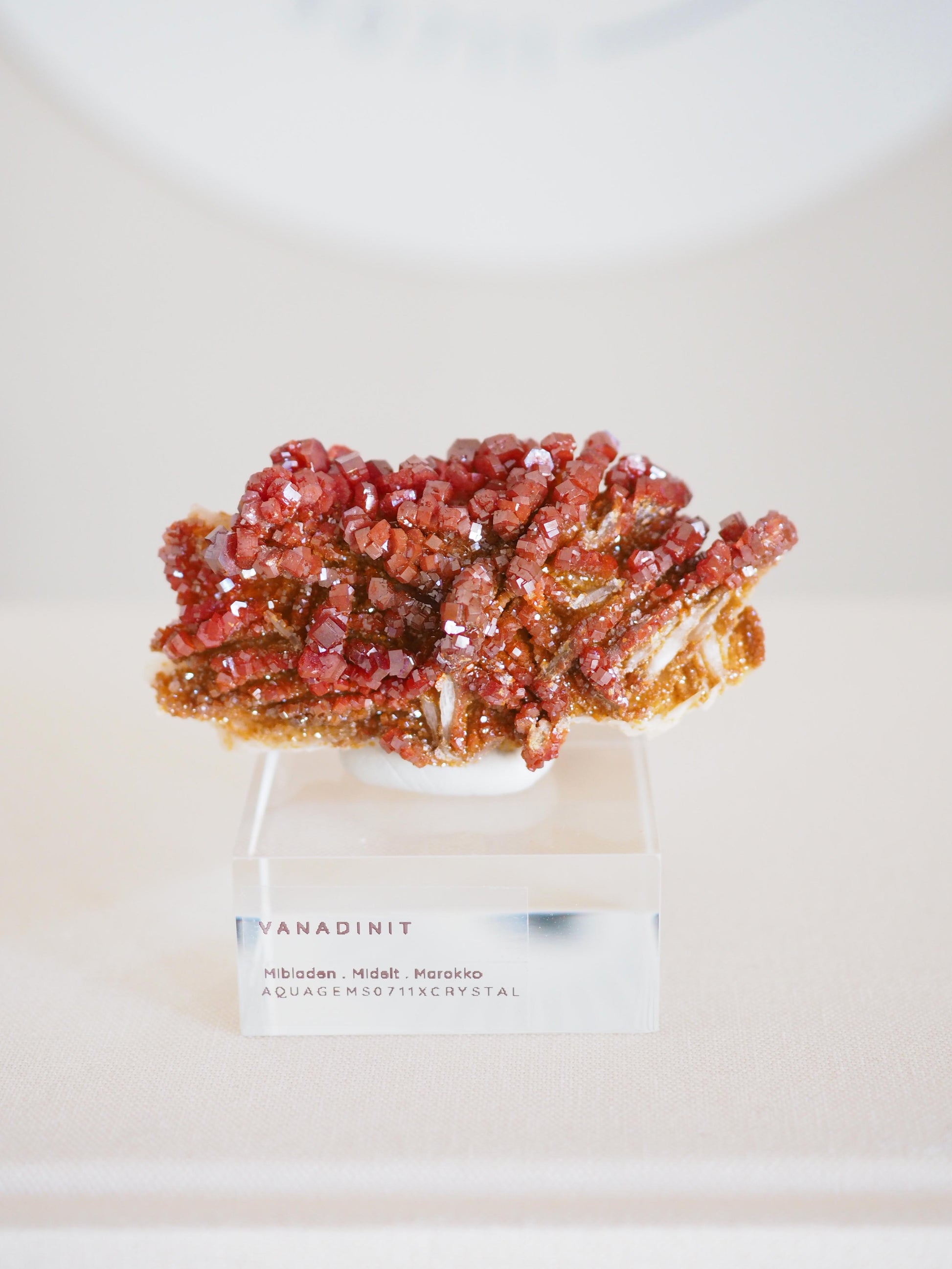 Tausende, präzise gewachsene, hexagonale Vanadinit Kristalle in einem rot-braunen Farbton treffen auf weisse Baryt Matrix. Fast wie eine Koralle zaubert Mutter Natur ein Meisterstück und ein Must-Have für jede Mineralien Sammlung.