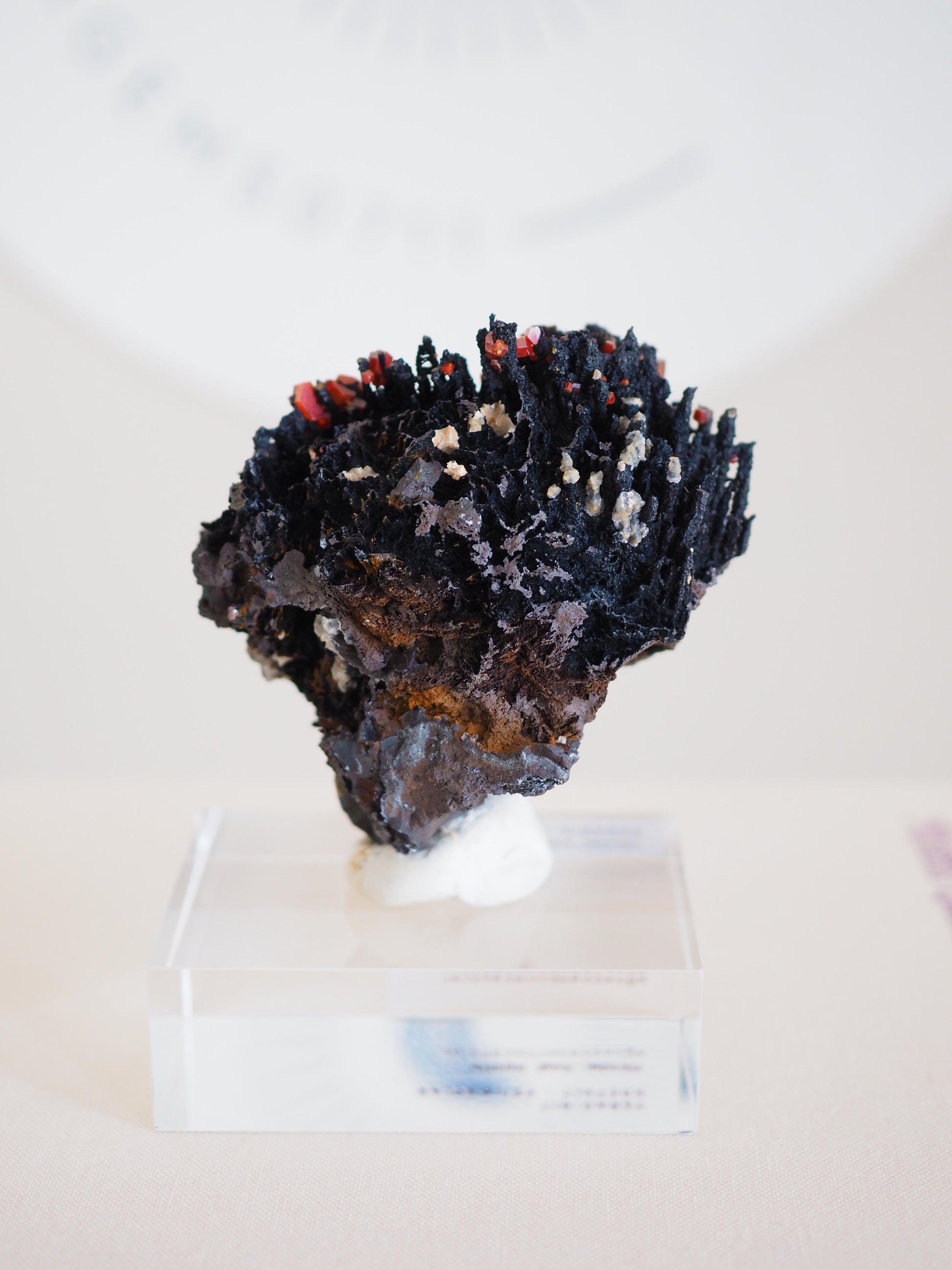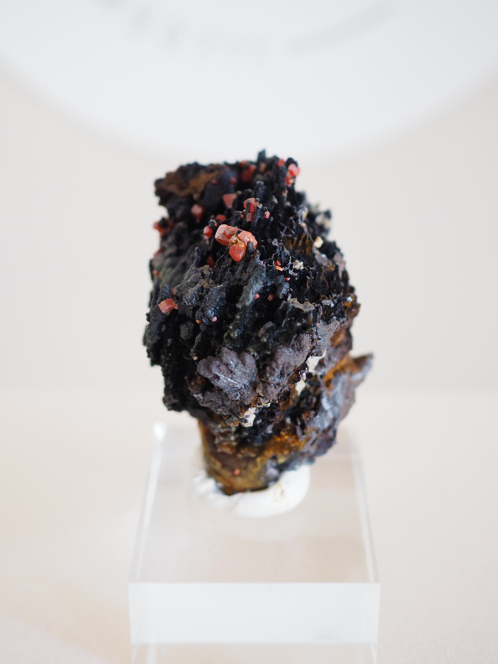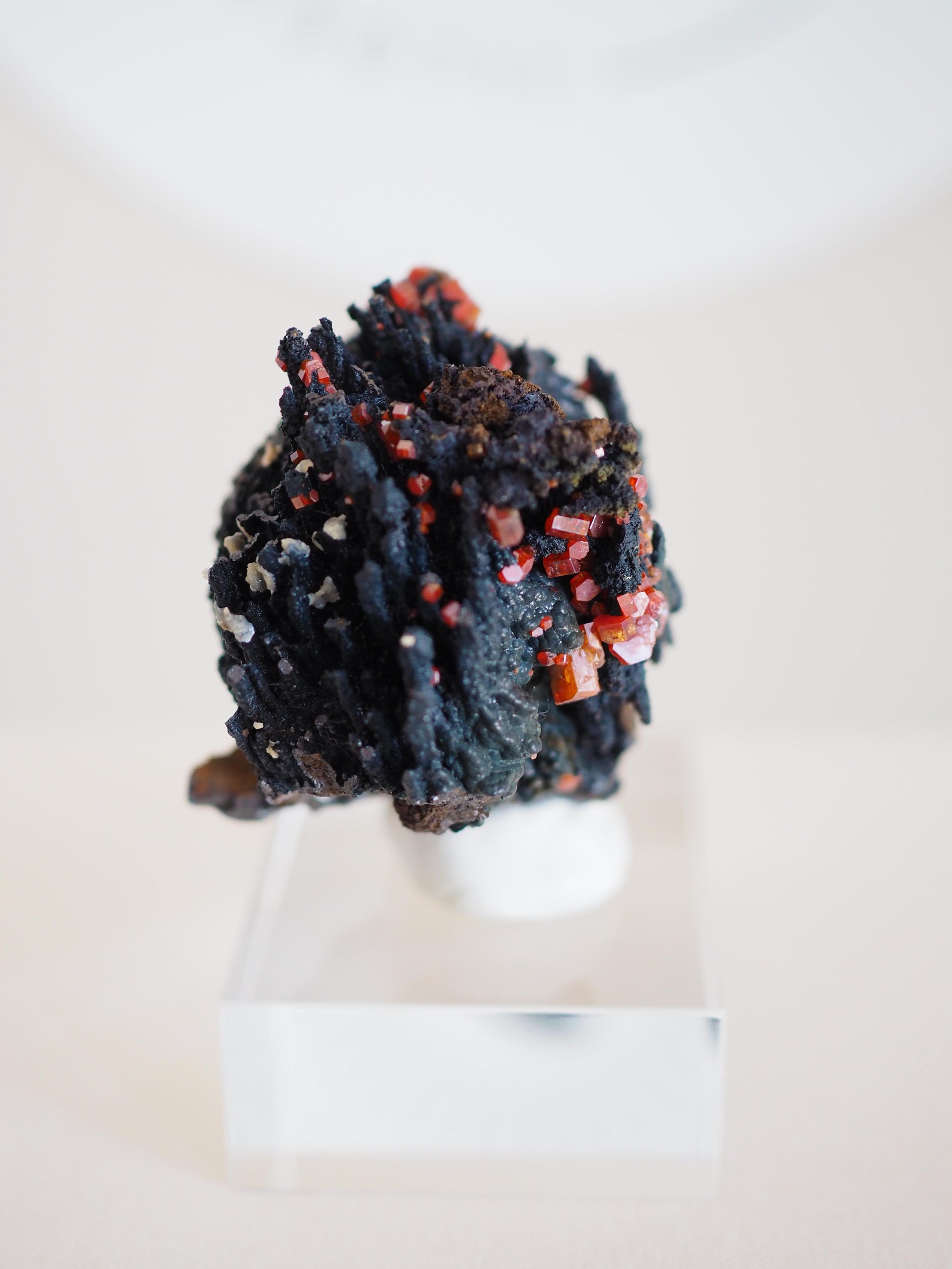 Dunkle, organische Formationen treffen auf präzise Kristallisation. Die intensive, leuchtend, rotorangene Färbung des Vanadinits leuchtet aus der matten aber zu schimmern scheinenden, dunklen Basis hervor und verleiht diesem Specimen eine besondere visuelle Tiefe. Ein raues, unverfälschtes Kunstwerk der Natur.